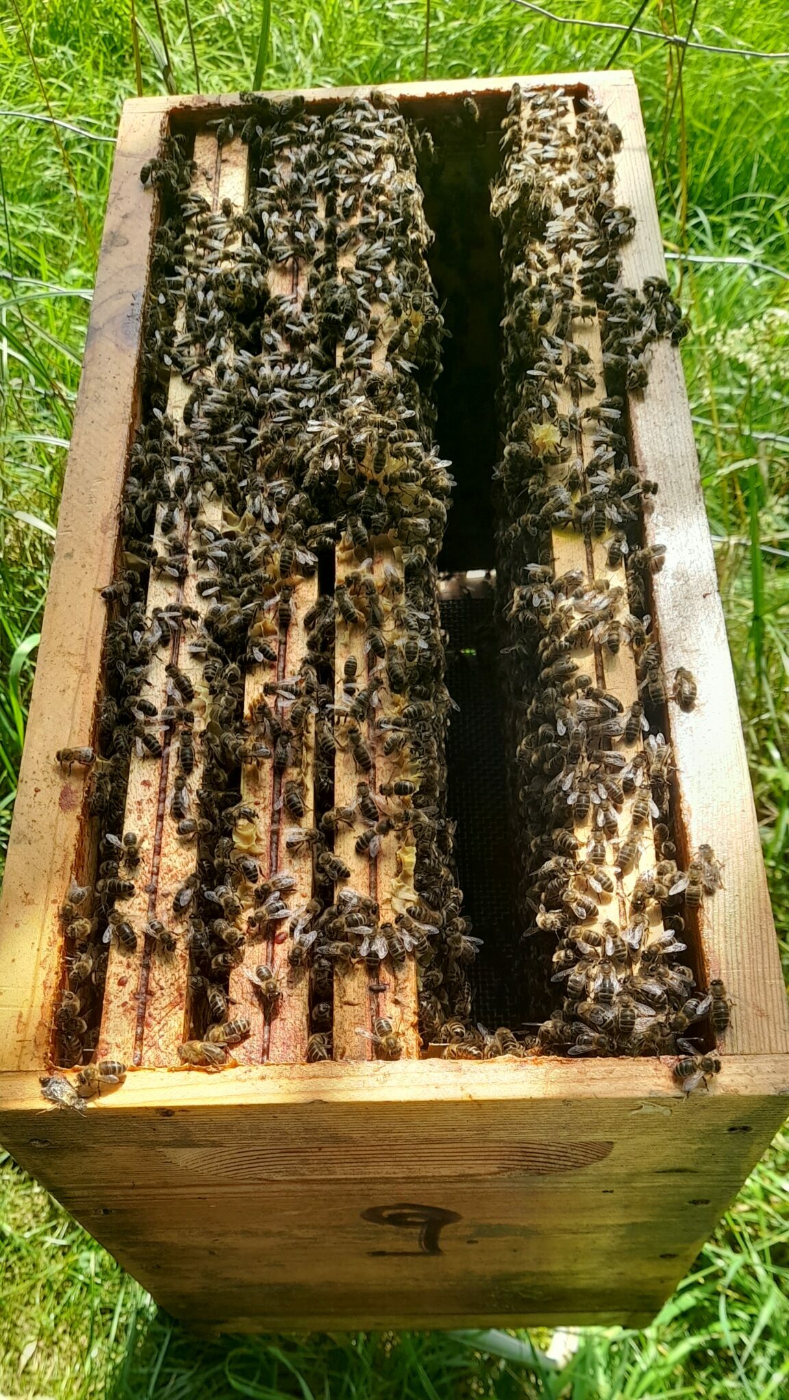 - L’essaim est composé de 5 cadres dadant : 3 cadres de couvains et 2 cadres de réserves